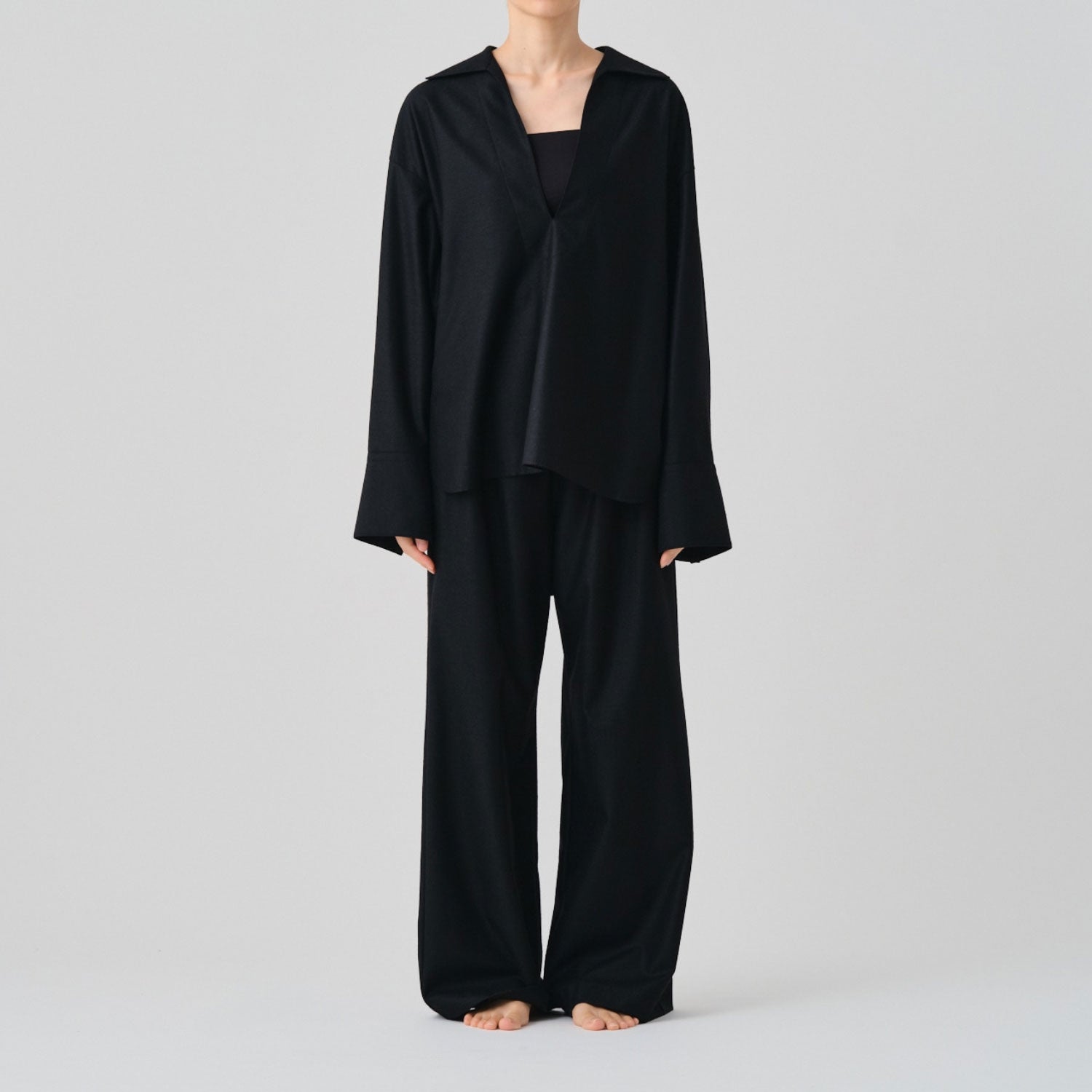 ウールのバランサーキュラーⓇ生地を使用した、リラックスシルエットのセミフレアパンツ。バランサーキュラーⓇは、日本独自のそれもたった数台しかない希少な編み機で、ジャージでありながらまるで織物のような不思議な生地です。ジャージ特有の伸縮性を維持しながらも、型崩れや、シワになりにくいのが特徴です。細番手の上質なウールに縮絨加工を施し、とても軽くしなやかに仕上げています。特殊ミシン(MLOCK®)を使い縫い合わせる時に必要な縫い代を極限まで細くする事で、素材の良さを100%引き出しています。見た目にも美しく、肌に直接触れる部分を最小限にし、着心地の軽さ、快適さを追求しています。ドレープがとても美しいドロースロリングセミフレアパンツです。