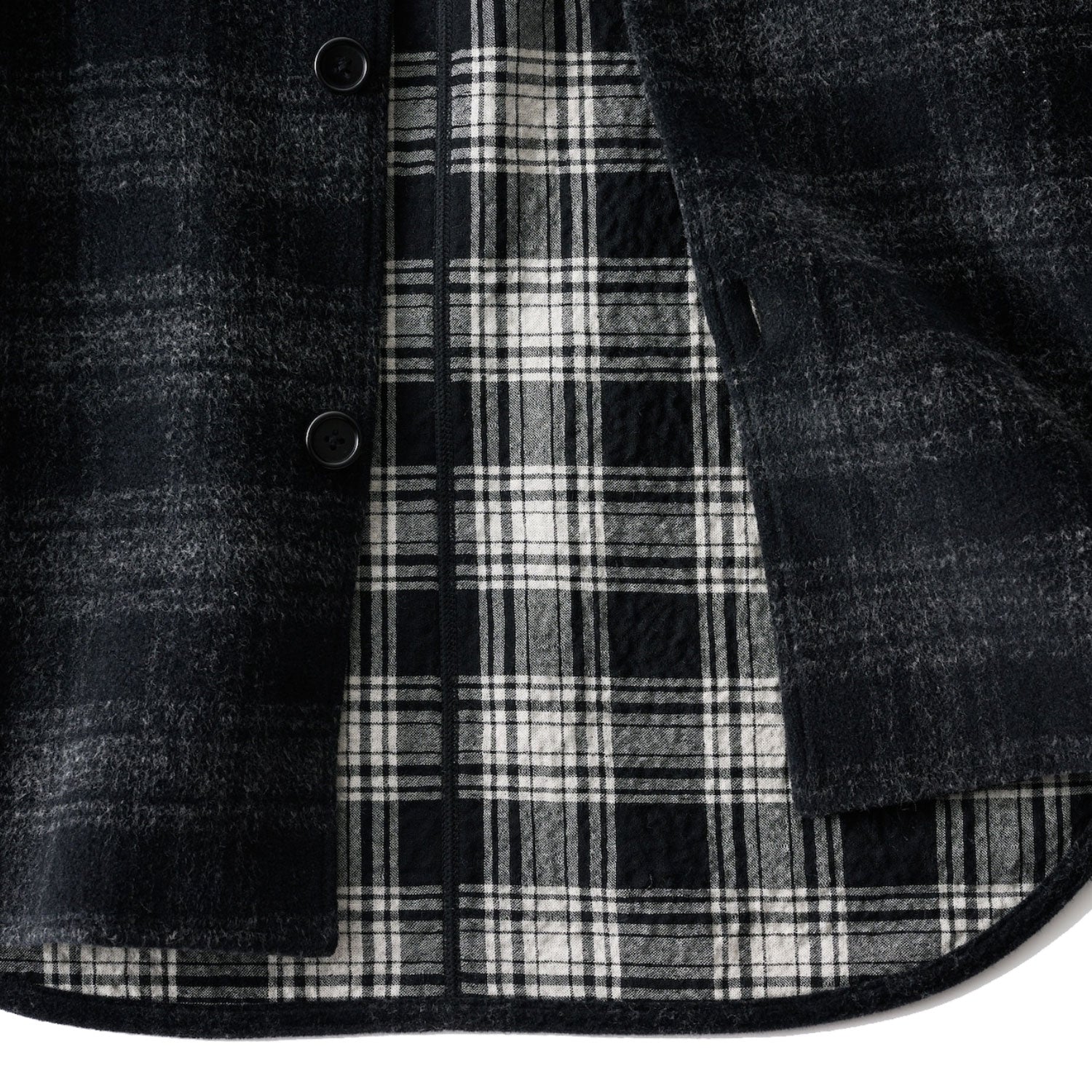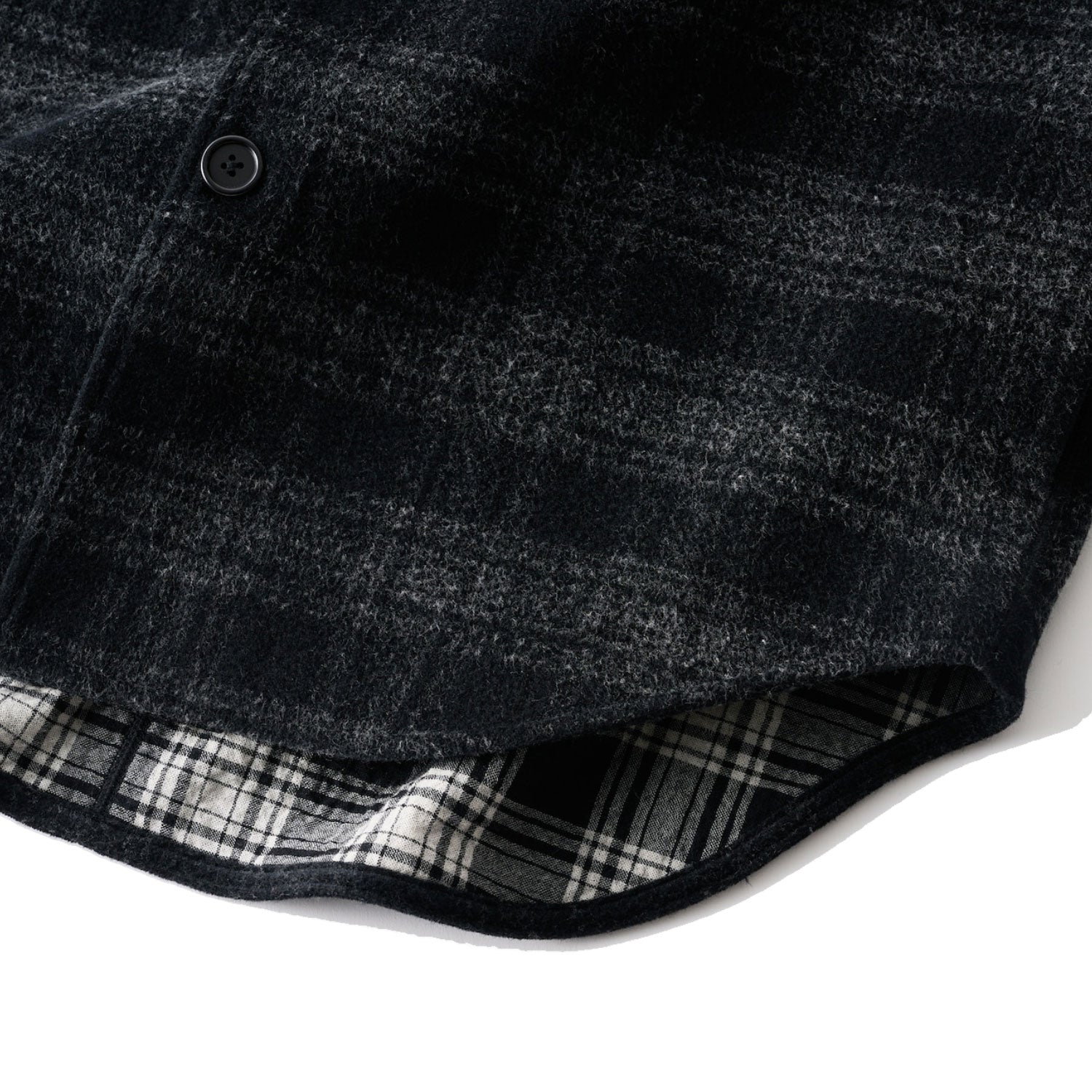 ニードルパンチ生地を使用した、オーバーシャツ。ニードルパンチ加工とは、剣山のような針で2枚の異なる生地の繊維を絡ませて圧着させるもので、熟練職人による希少な伝統技術です。使用している生地は透けるほど薄く軽いチェック柄のウールガーゼと伸縮性のある無地のジャージベロアです。加工の過程で無地のベロアにチェック柄を浮かび上がらせ、独特の表情を生み出します。ふんわりと空気を含ませることで驚くほど軽く、暖かな生地に仕上げています。特殊ミシン(Mseamer®)を使い、縫い合わせる時に必要な縫い代を極限まで細くする事で、素材の良さを100%引き出しています。見た目にも美しく、着心地の軽さ、快適さを追求しています。秋口には軽やかなアウターとして、冬にはインナーとしてもお誓いいただけます。